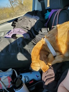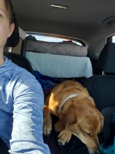 The moving space continues west. And you do what you do. You have not achieved official shotgun privileges, but your human has compromised. You can lay your head over the console, and that is comfortable enough.