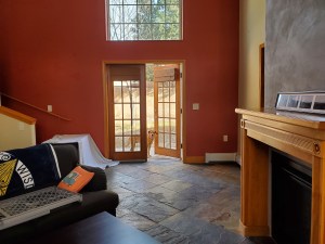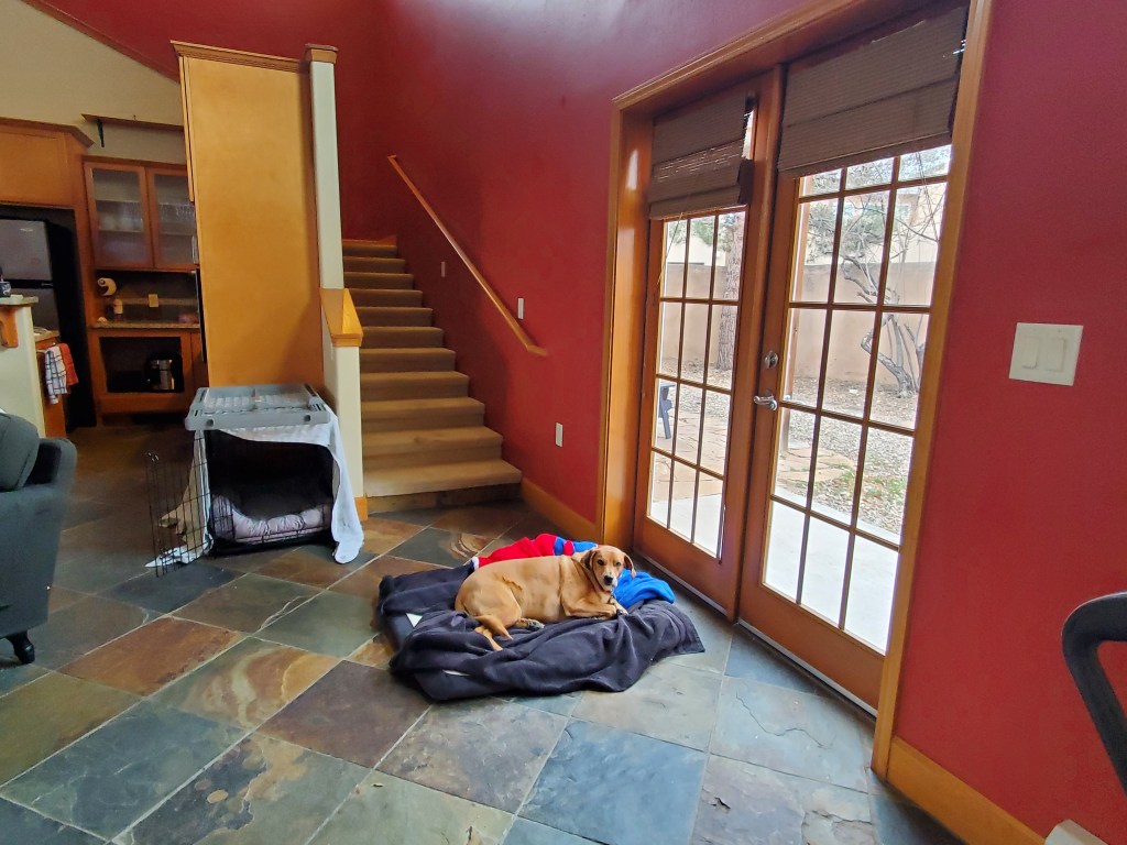 When you wake up in the unfamiliar-but-comfortable place with the familiar human, you stretch. Then you bark. Familiar human opens a portal, and you sniff the tiny yard. There’s no grass here. No squirrels. No toys.